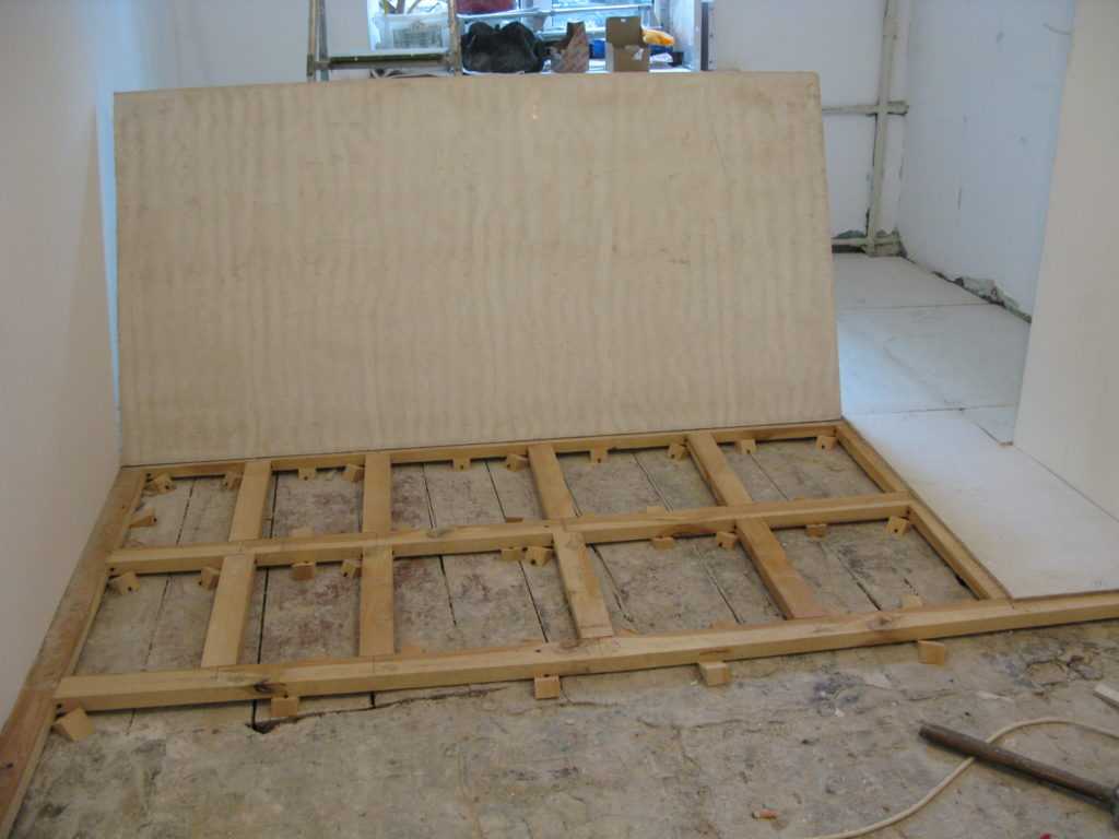 Далее укладывается настил из досок или плит и выполняется финальная отделка напольной конструкции.