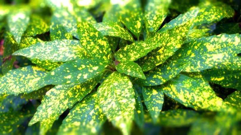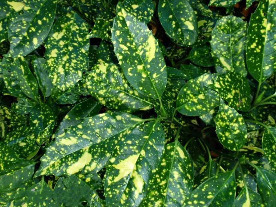 Аукуба очень просто узнать по довольно плотным глянцевым листьям, имеющим характерные желтые пятнышки.