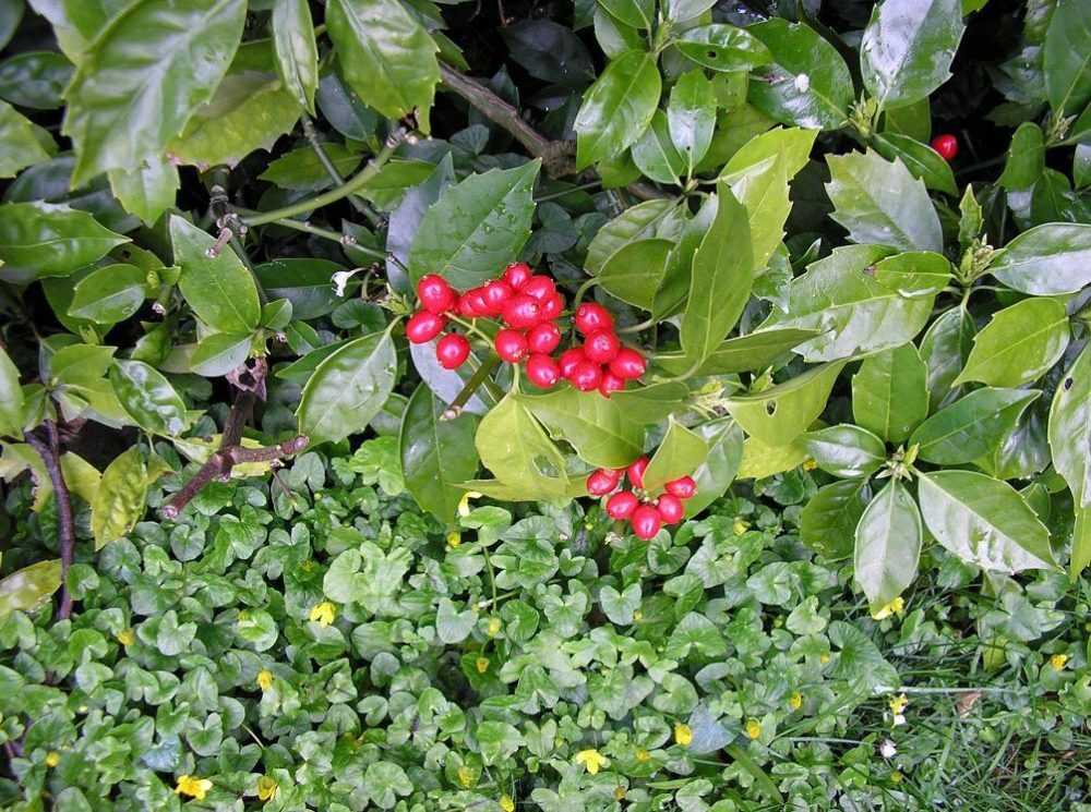 | Аукуба Гималайская | Листья удлинённые, ланцетовидной формы. Края листовой пластины, окрашенной в тёмно-зелёный цвет, зубчатые или цельнокройные. Верхушка заострённая. Растение двудомное. Цветки маленькие. Ягоды кораллово-красные. |
