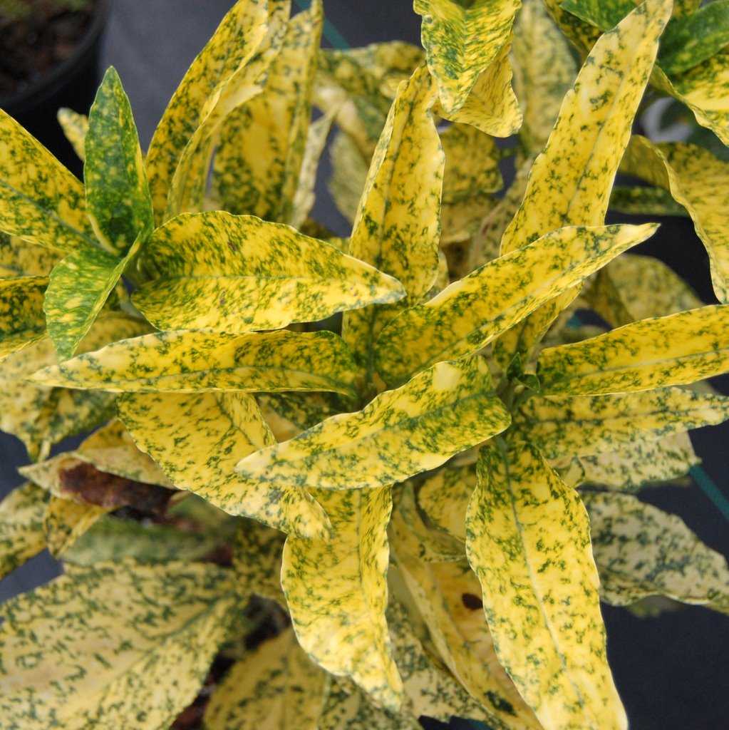 - Аукуба Кротонифолия — высокий кустарник, который в ширину достигает 3 метров. Листья вырастают до 20 см. Крапинки разной формы, и они могут сливаться в небольшие рисунки.