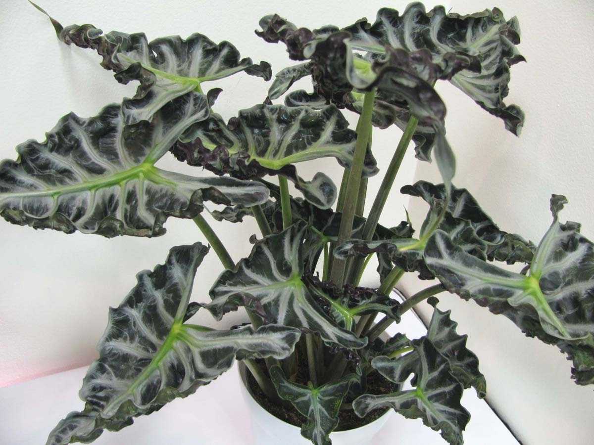 Алоказия — травянистое растение высотой до 1 метра. Любит жару, высокую влажность, умеренный полив. Не переносит прямых солнечных лучей.