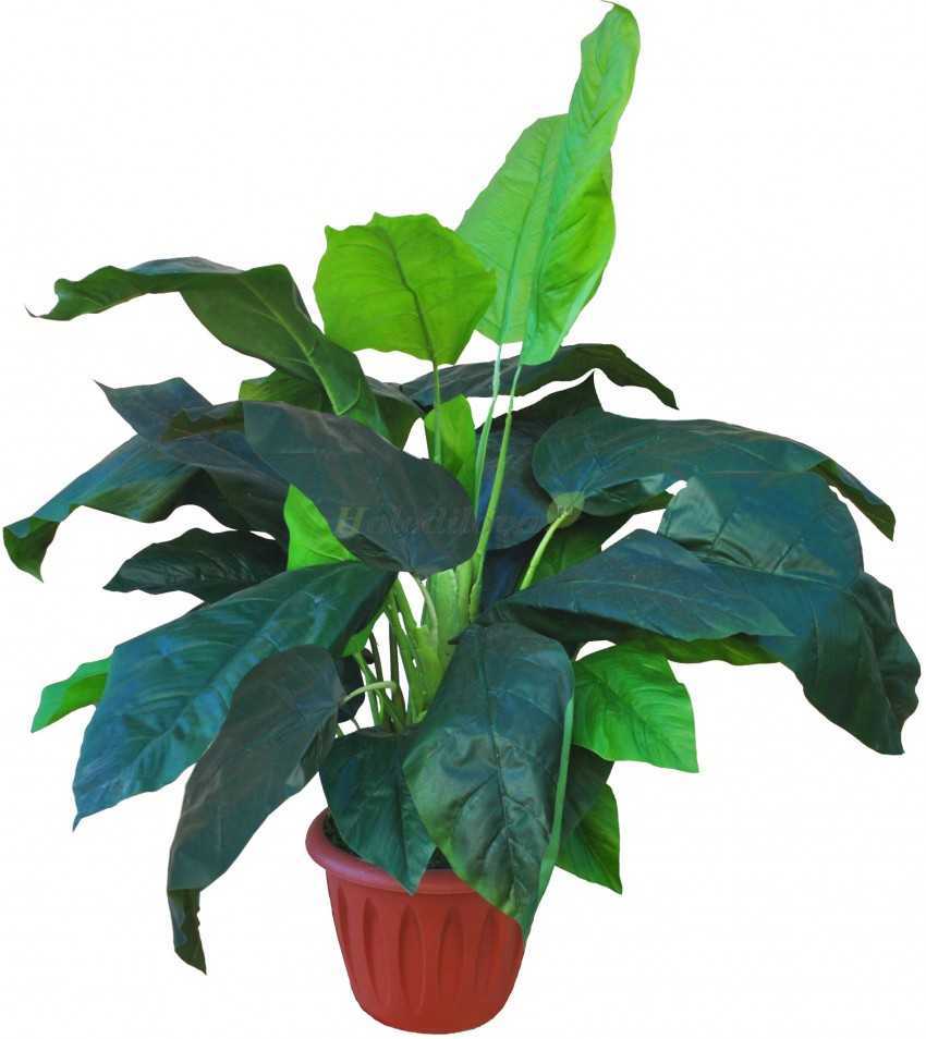 Гигантский красавец прекрасно подходит для озеленения больших и просторных помещений. Куст в высоту может вырасти до полутора метра. У него огромные темно-зеленые листочки. Форма у них ребристая и в длину вырастают до 75 см, а в ширину приблизительно до 40 см. Белые цветки у растения крупные, до 40 см.